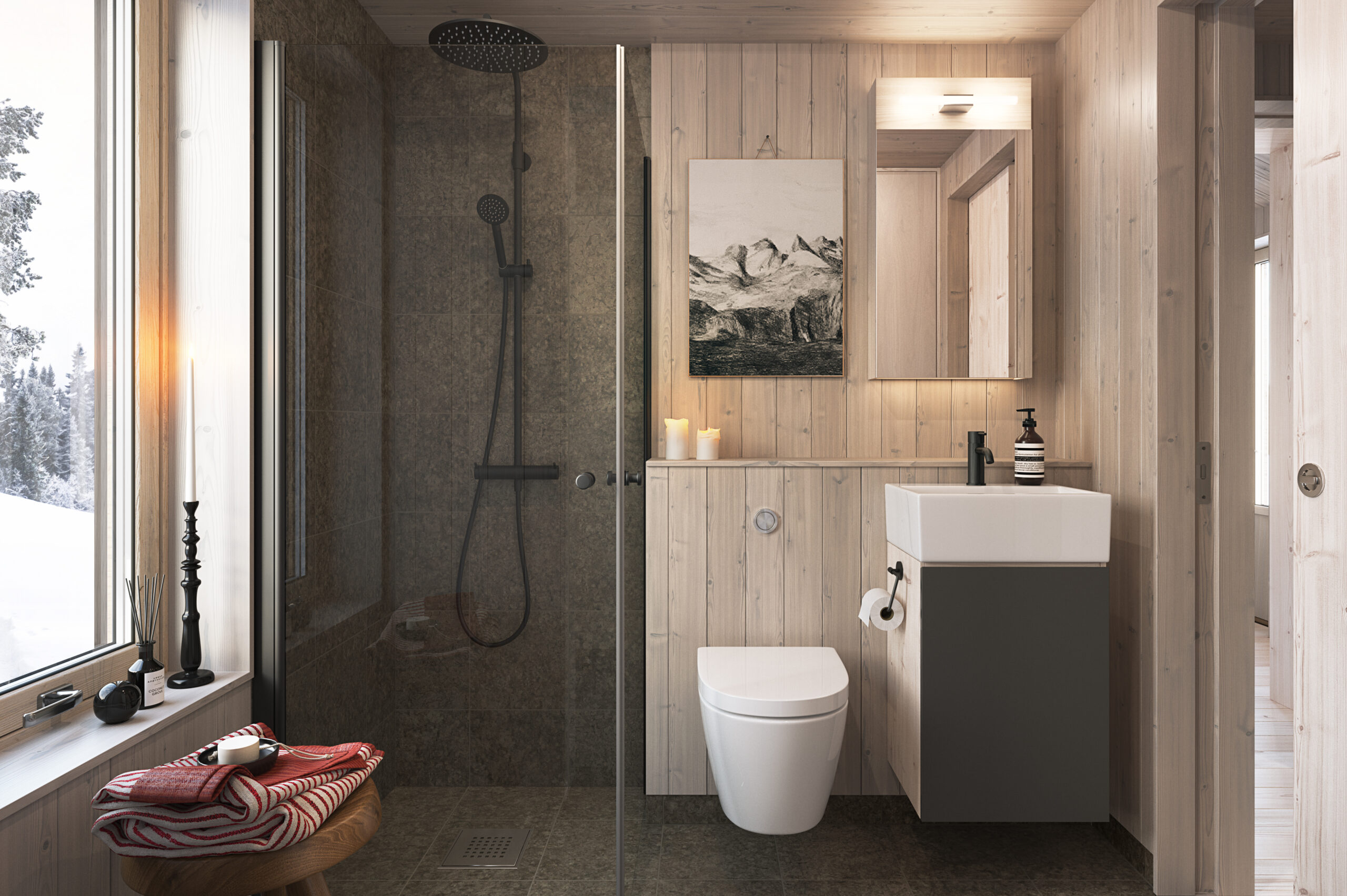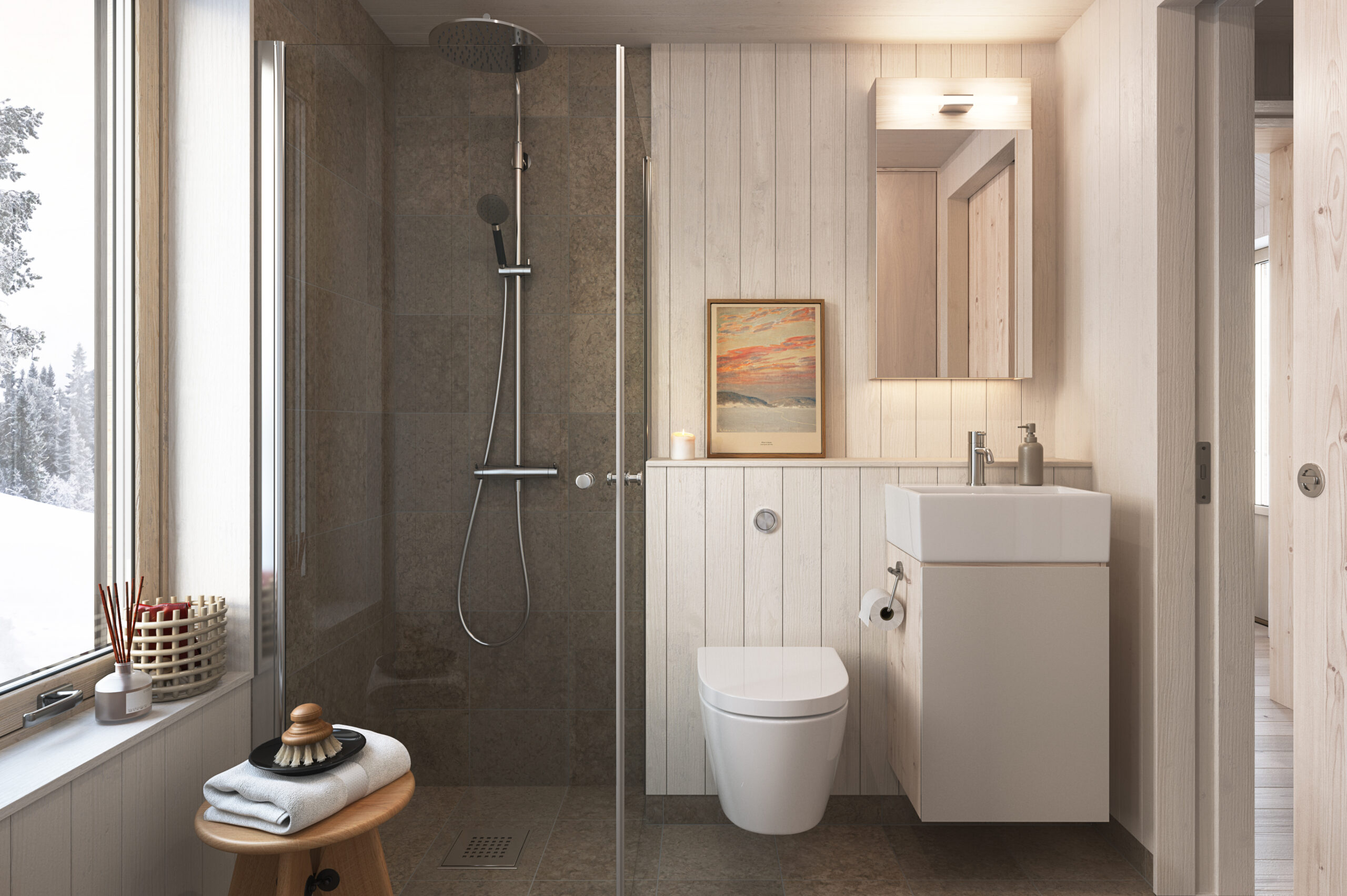 Hallen är anpassad för fjällivet med förvaring och torkskåp för ytterkläder och pjäxor. Extra toalett kan väljas till, alternativt förråd i standardutförande. Loft kan adderas.