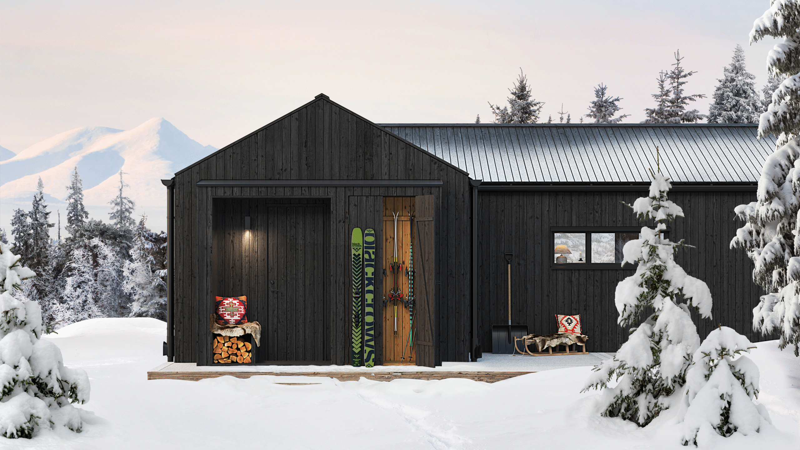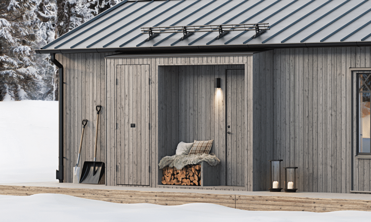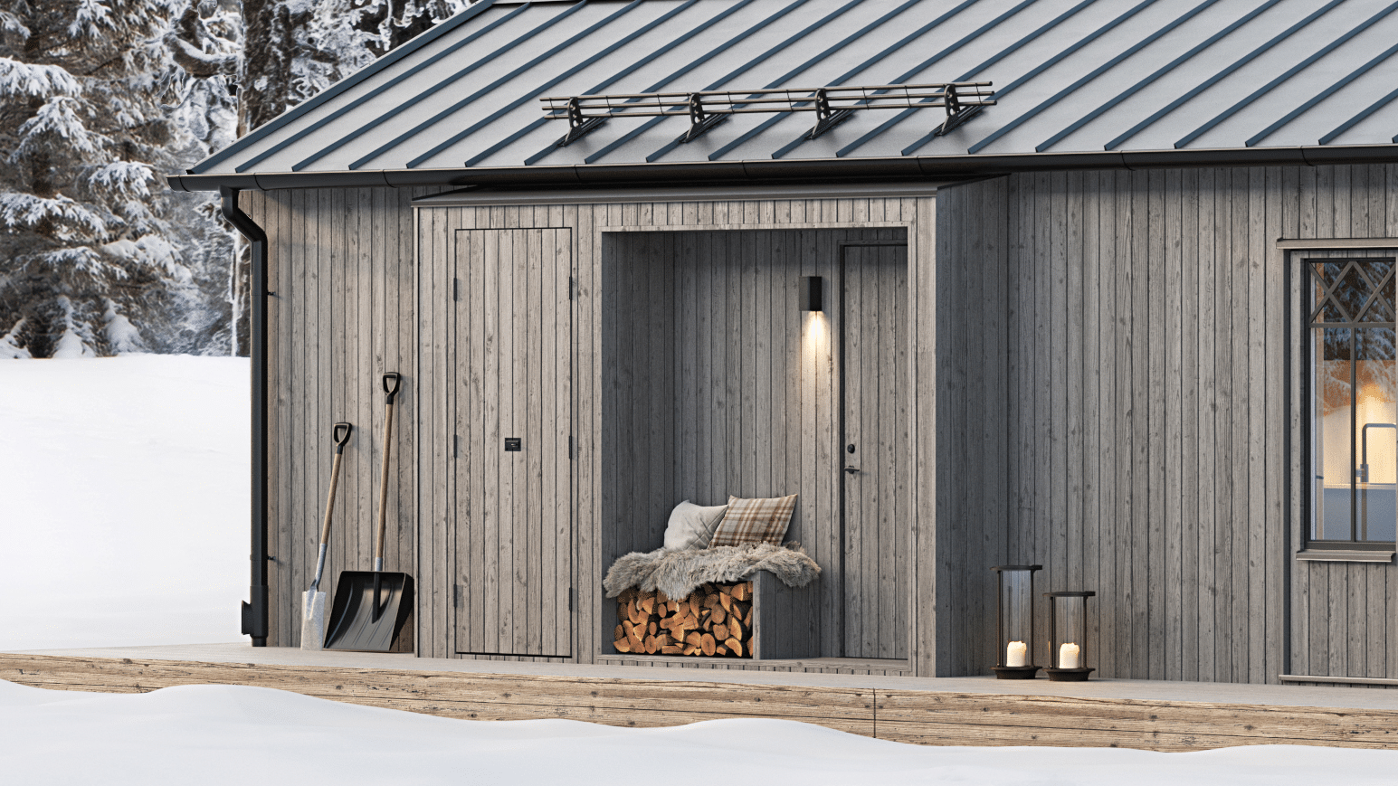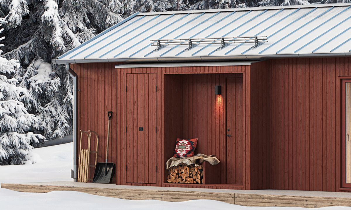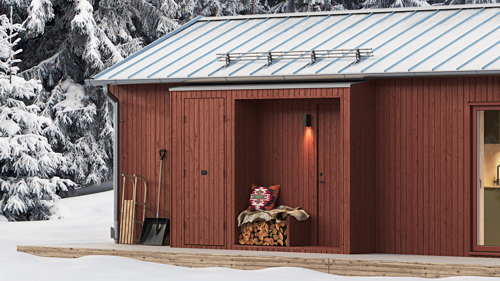 Den utvändiga förrådsdelen rymmer skidor, ved och utrustning i direkt anslutning till huset – samlat och lättillgängligt. Tillägget följer husets proportioner och material och är formgivet som en naturlig del av arkitekturen.